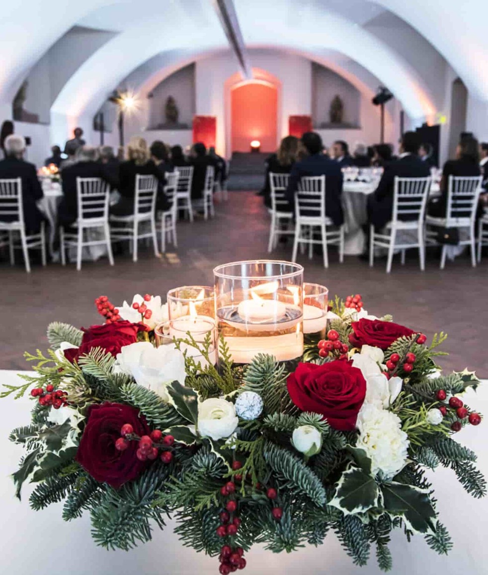 Quando gli ospiti hanno concluso l’evento privato alla Pinacoteca Ambrosiana e ammirato i disegni originali di Leonardo da Vinci e si stavano apprestando a uscire per raggiungere la location della cena, le porte dell’antica Sala Sottofedericiana si sono aperte per mostrare un tavolo elegantemente preparato sotto le volte secentesche.